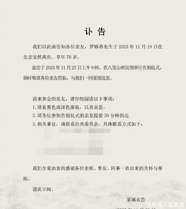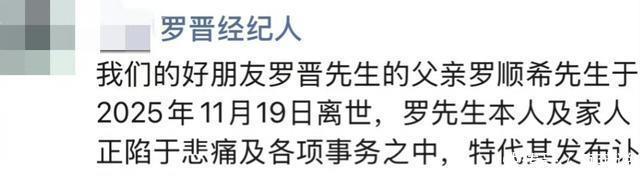 罗晋经纪人于11月20日在朋友圈代发讣告,确认罗父于11月19日安然离世。罗晋及家人正陷于悲痛,全力处理治丧事宜,暂未公开发声。